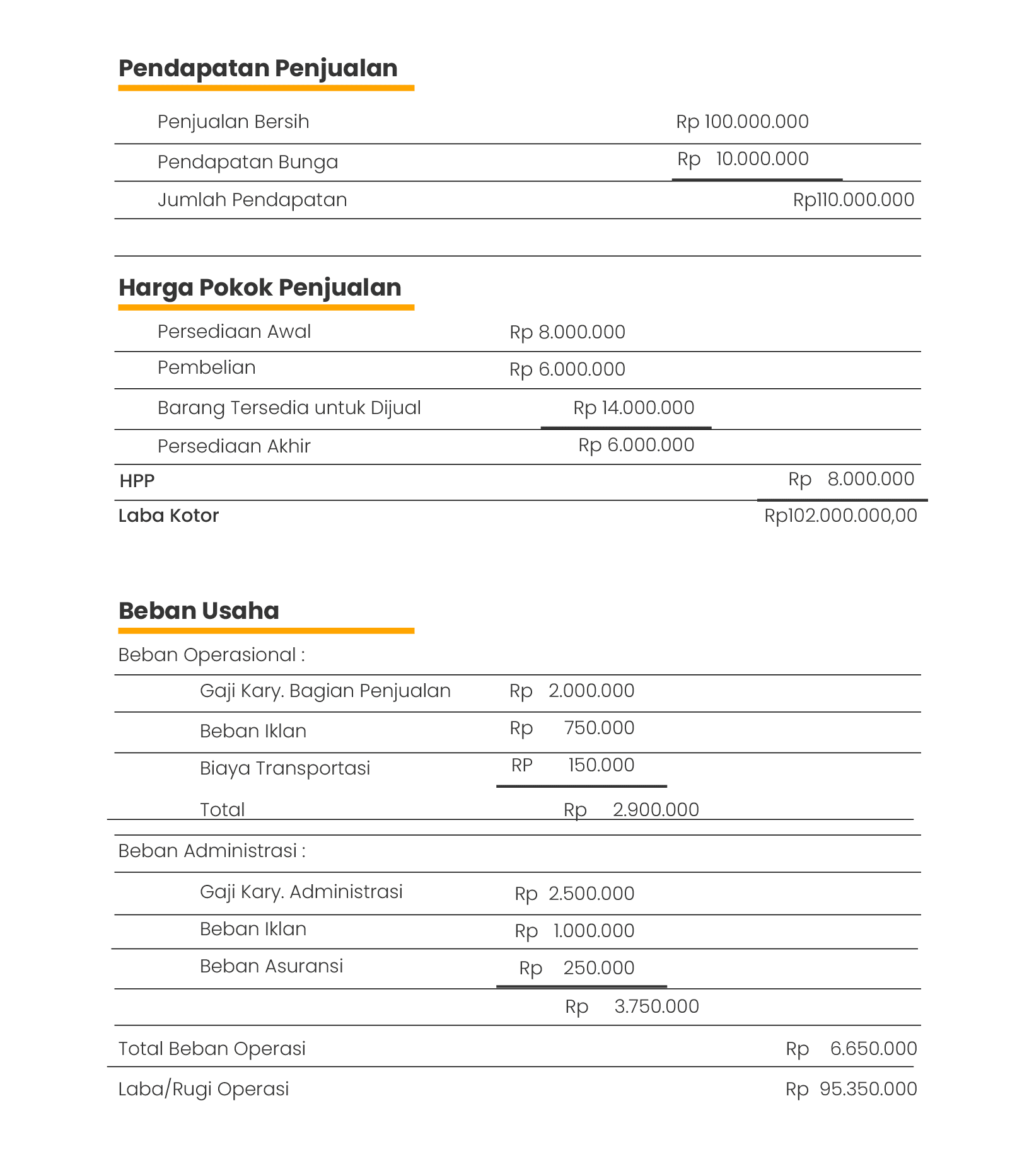 Format laporan sinlge step terdiri dari akun pendapatan (di awal laporan), harga pokok produksi, beban dan biaya untuk . Ini adalah contoh membuat laporan laba rugi perusahaan jasa dengan metode single step. Alasan suatu perusahaan menggunakan bentuk laporan single step ini . Contoh laporan keuangan rugi laba. Susunan laporan rugi laba, 2.