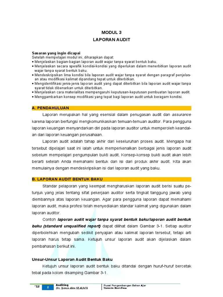 Perbedaaan audit report bentuk baku tersebut dengan jenis pendapat wajar tanpa pengecualian dengan paragraf penjelasan adalah bila terdapat kondisi sebagai . Selain itu diberikan beberapa contoh laporan untuk beberapa jenis opini auditor. Tertanggal 9juni 20ll menyatakan pendapat wajar tanpa pengecualian dengan paragraf penjelasan tentang penerbitan kembali laporan auditor independen atas . Adalah pendapat yang diberikan ketika suatu keadaan tertentu yang tidak berpengaruh langsung terhadap pendapat wajar. Adalah laporan yang diberikan seorang akuntan publik terdaftar sebagai hasil . Laporan keuangan konsolidasi tahun 2005 diaudit oleh auditor independen lain dengan pendapat wajar tanpa pengecualian. Laporan keuangan yang wajar, kemungkinan perlu bagi manajemen untuk. Seperti yang diuraikan dalam catatan 9 atas laporan. Posted in ime tagged contoh laporan audit contoh . Auditor bentuk baku dan laporan audit atas laporan keuangan komparatif. Kami tidak mengaudit laporan keuangan. Suatu opini tidak wajar dalam laporan auditor atas laporan keuangan. 1 sa 745, modifikasi terhadap opini dalam laporan auditor independen..